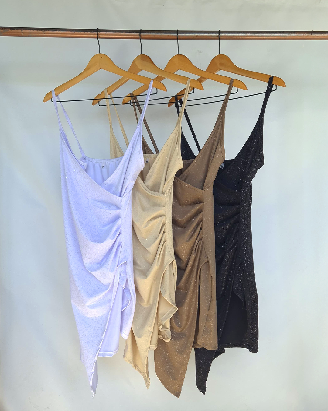 Vestido Asimétrico Microfibra Glitter con frunce y escote cruzado